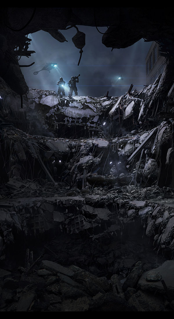 I used both regular brushes and photos of damaged concrete-buildings and tried to integrate them in the damaged areas. It was a lot of work to make it look natural and fit the surroundings. The finished version also had everything layered and organized in alpha layers in order for the 3D artist to project it onto a mesh and be able to move the camera around!